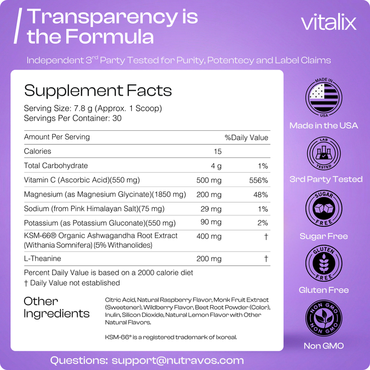 Amazon CustomerVitalix packs clinically backed ingredients; KSM-66 ashwagandha, magnesium glycinate, L-theanine, Vitamin C, potassium, and even Pink Himalayan salt. I love that it’s sweetened with monk fruit and not overly sweet like other mixes. It’s made in the USA, third-party tested, and tastes great when mixed as directed. Everything I look for in a supplement.