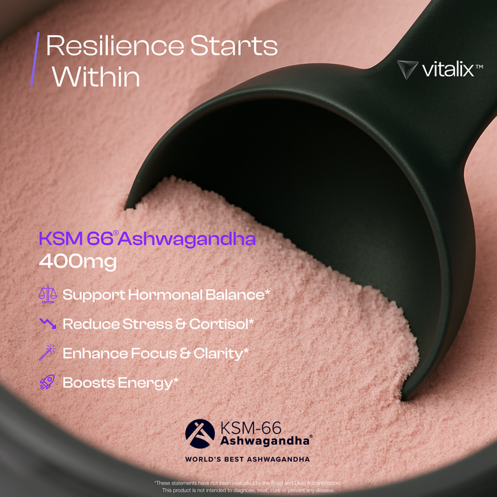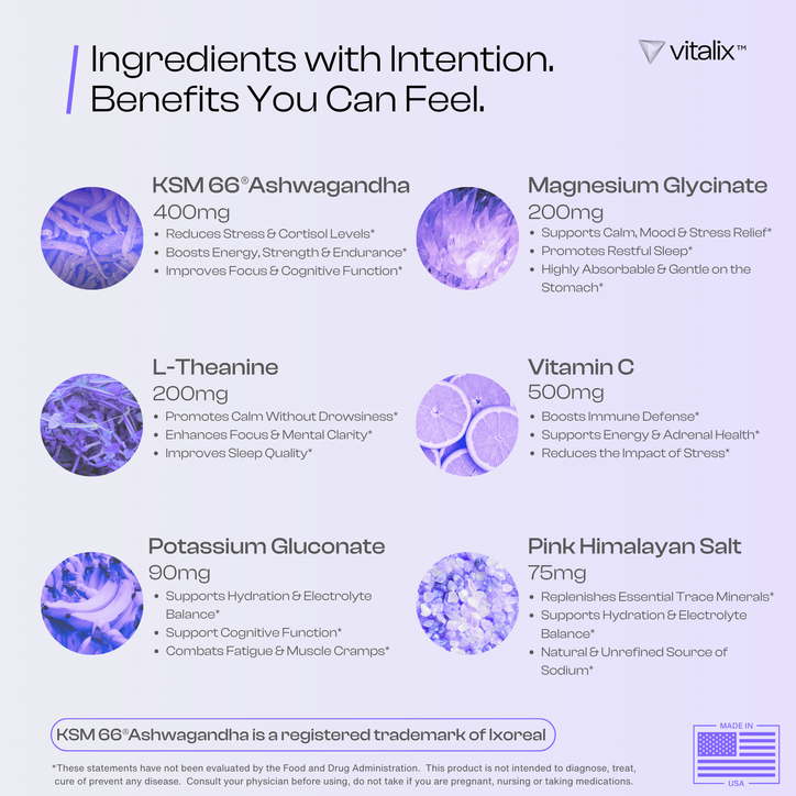 Stress doesn't play by the rules. That's why we created Vitalix, a clinically supported blend of KSM-66® Ashwagandha, Magnesium Glycinate, L Theanine along with key minerals, and essential nutrients for optimal absorption and real results.